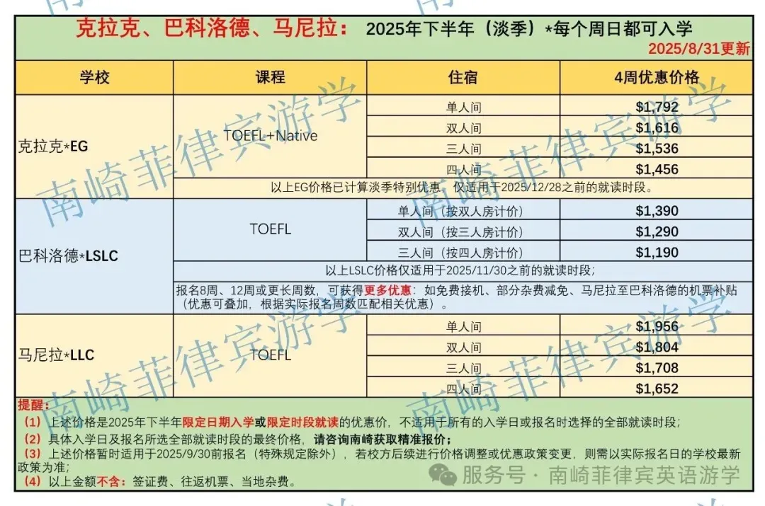 南崎汇总了菲律宾主流语言学校 托福课程 2025年淡季的最新价格 ,相比旺季,学费更具性价比,学习环境也更加安静专注,老师选择范围更广,最关键是价格优惠更多。