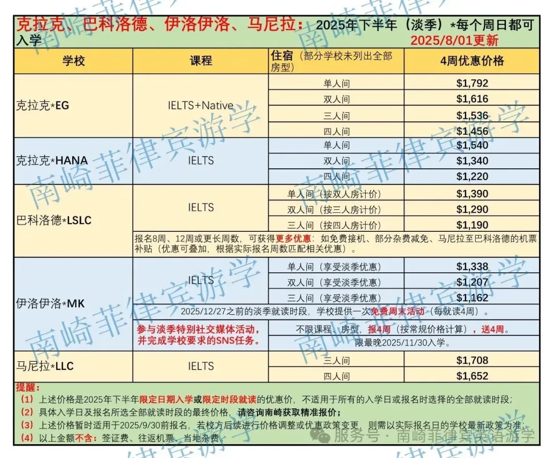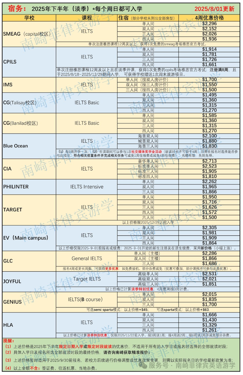 南崎汇总了菲律宾主流语言学校 雅思 课程在2025年淡季的最新价格清单 ,相比旺季,学费更具性价比,学习环境也更加安静专注,老师选择范围更广,最关键是价格优惠更多。