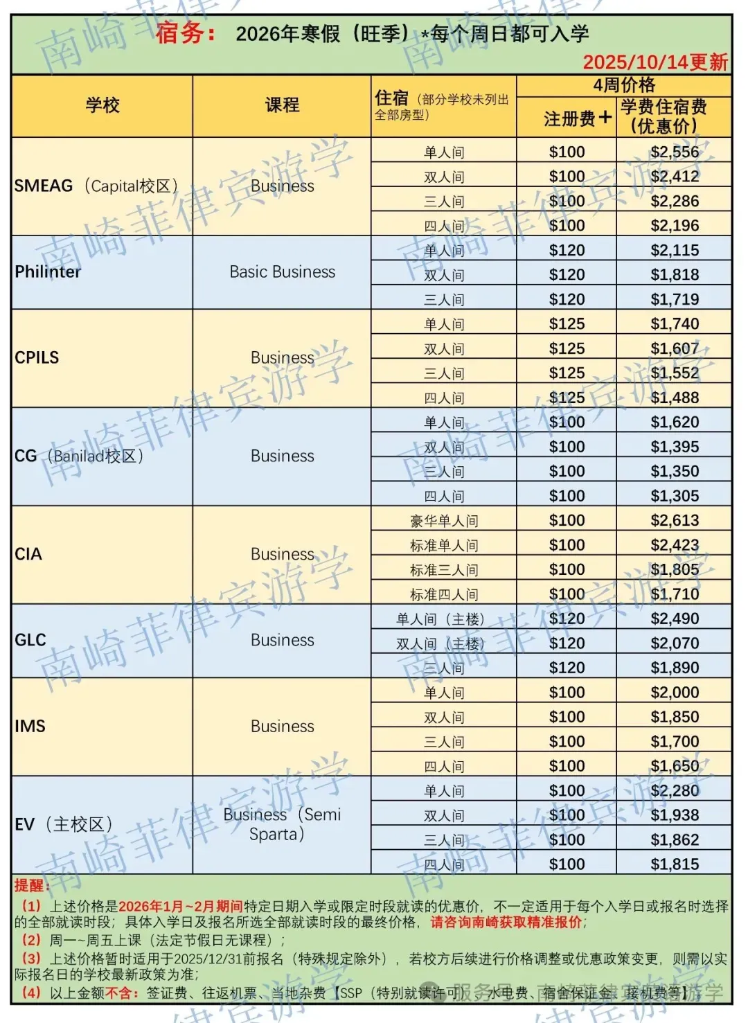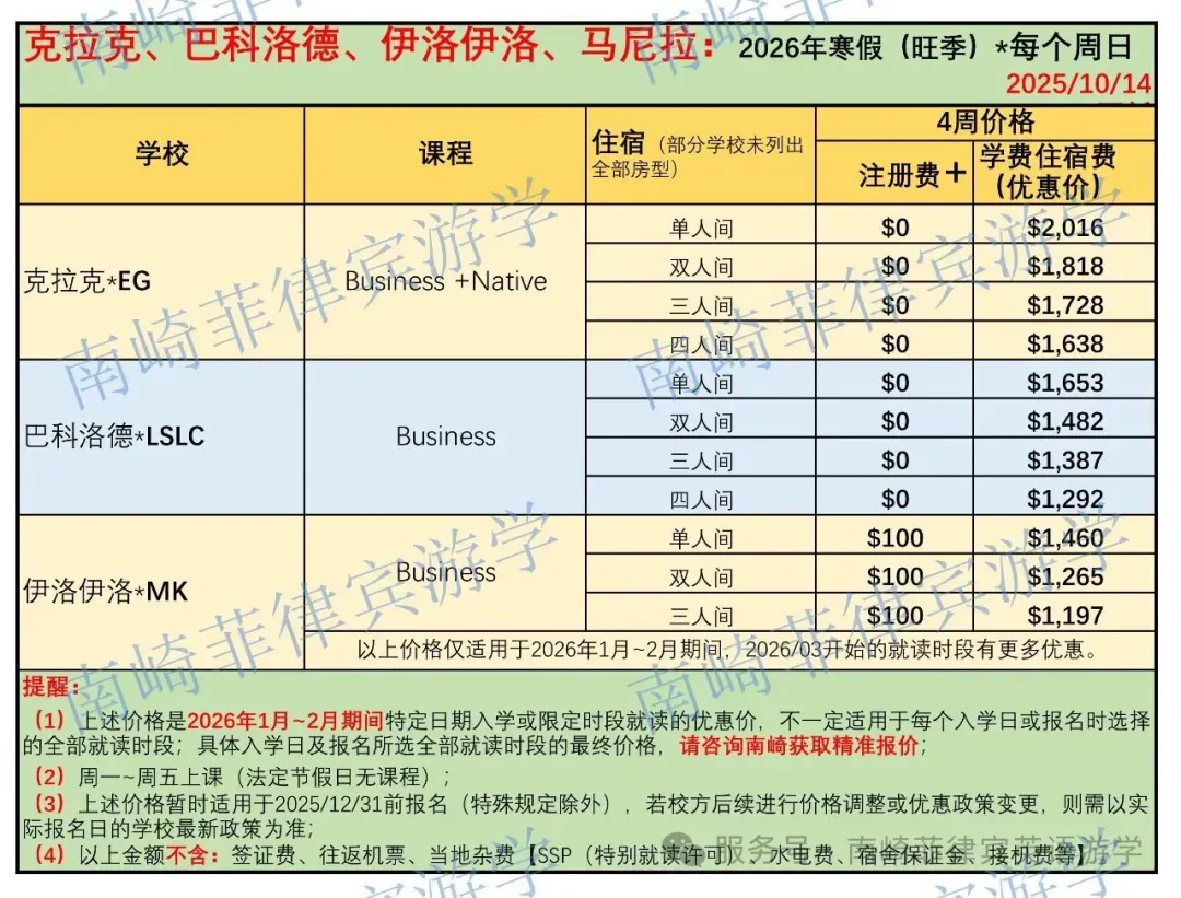 2026寒假菲律宾游学倒计时不到3个月! 计划寒假来菲律宾游学的成人同学,可参考南崎整理的各校信息: