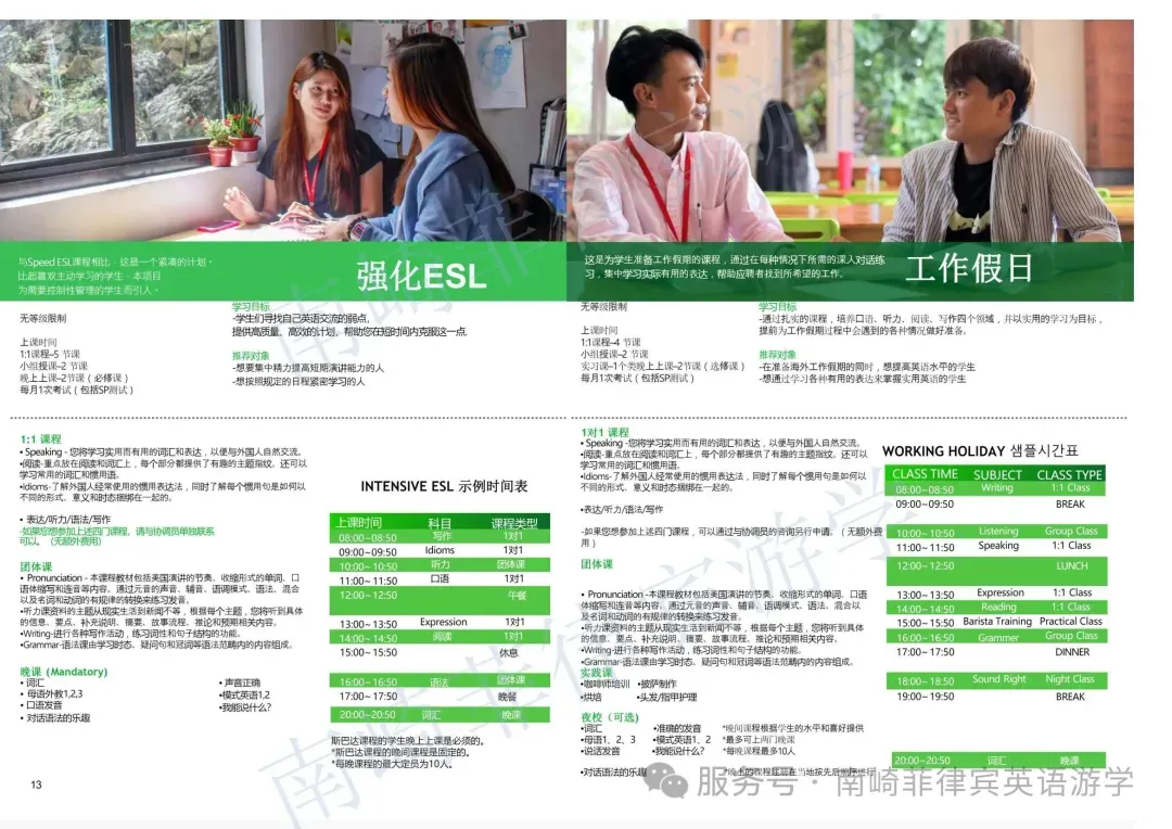 选修课程 :小班制最多6人,按学生水平分班,可每月选择兴趣课程;提供一般英语及打工度假准备课程