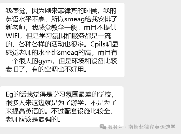 这个学校虽然规模小且在中国市场并不知名,但是服务不要太好!丰富多彩的周末活动+细心负责的老师,我们南崎推送的三组家庭全部满意而归, 有家长直呼“这是三次菲律宾游学中体验最好的一次”。