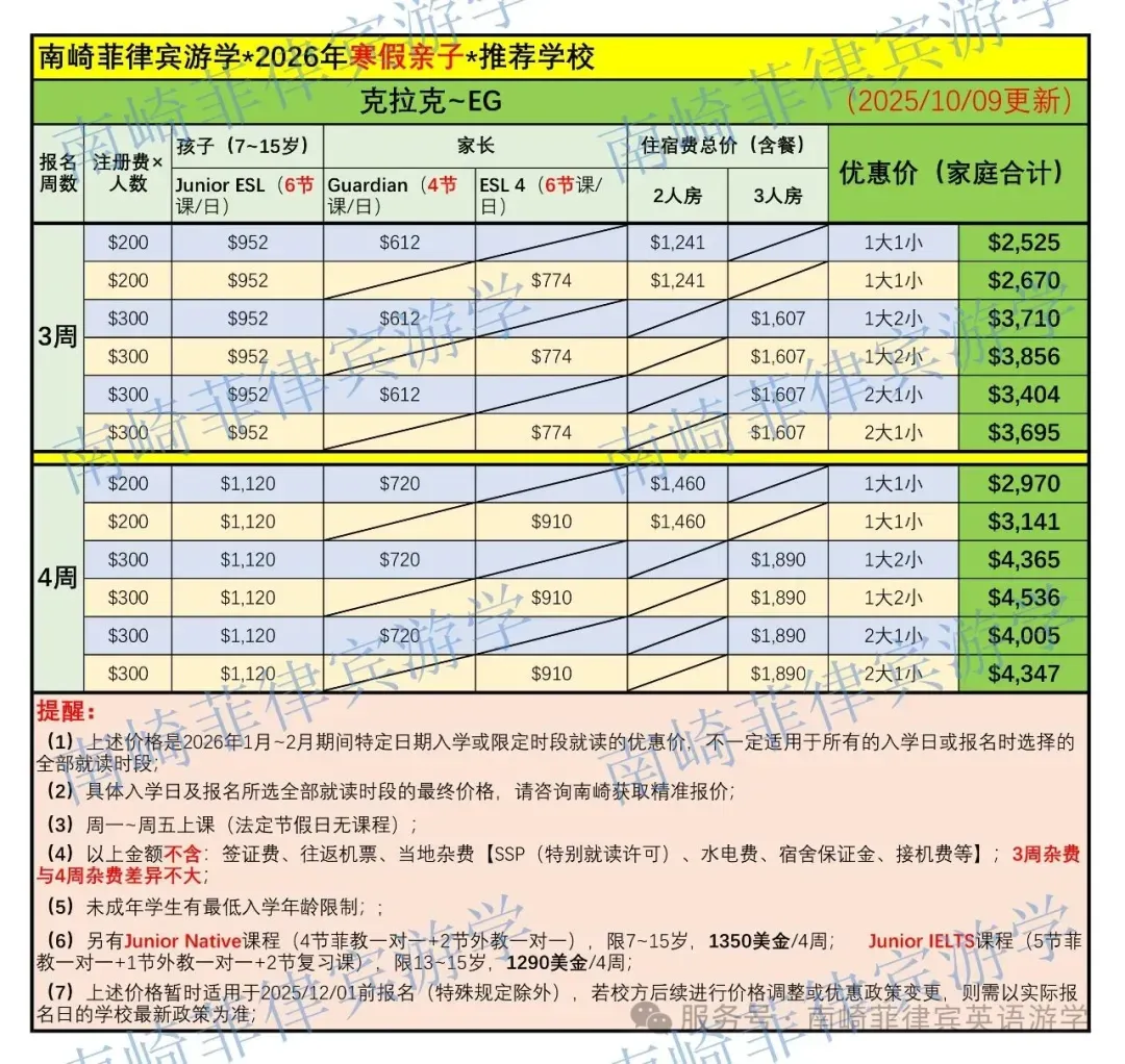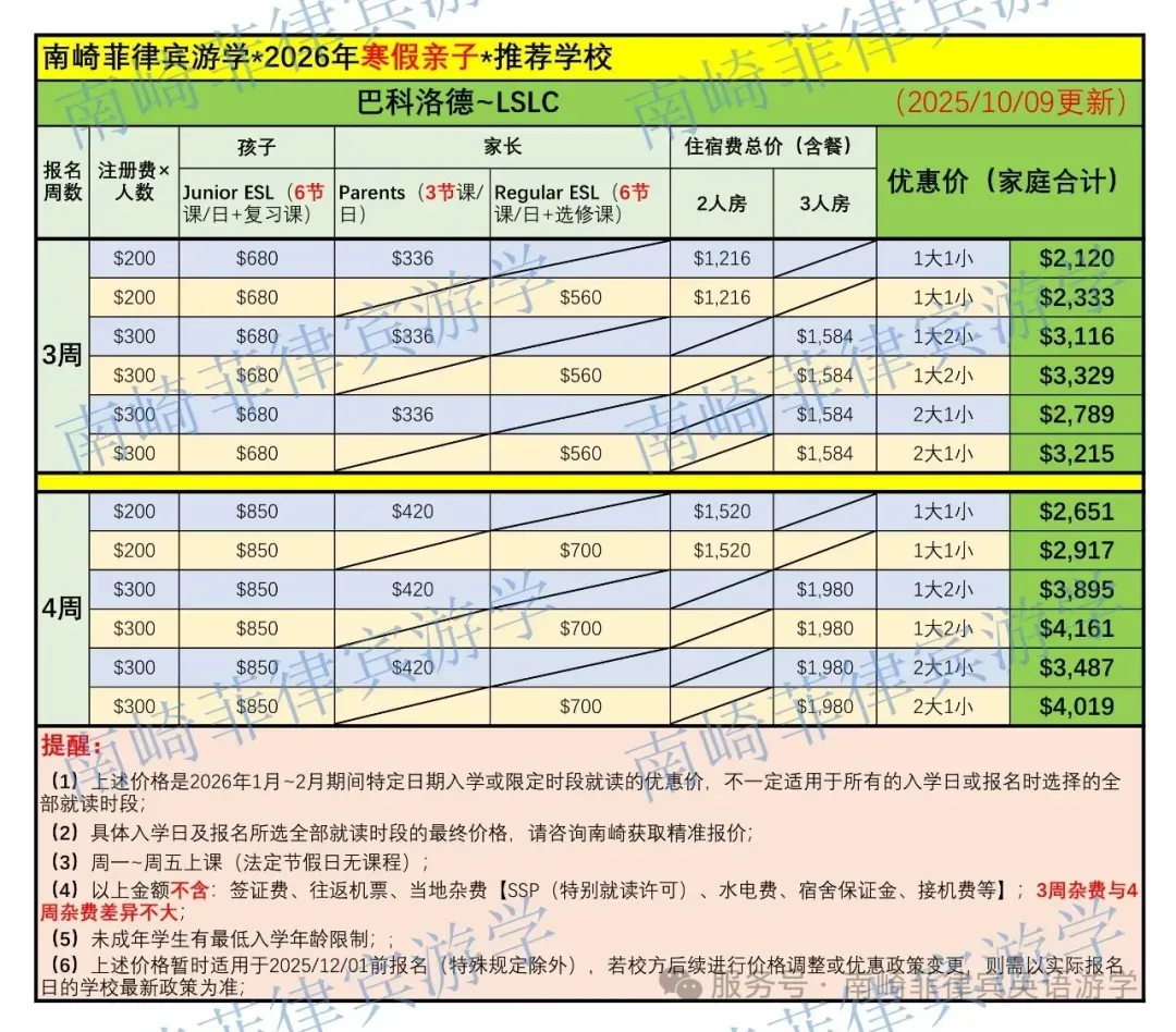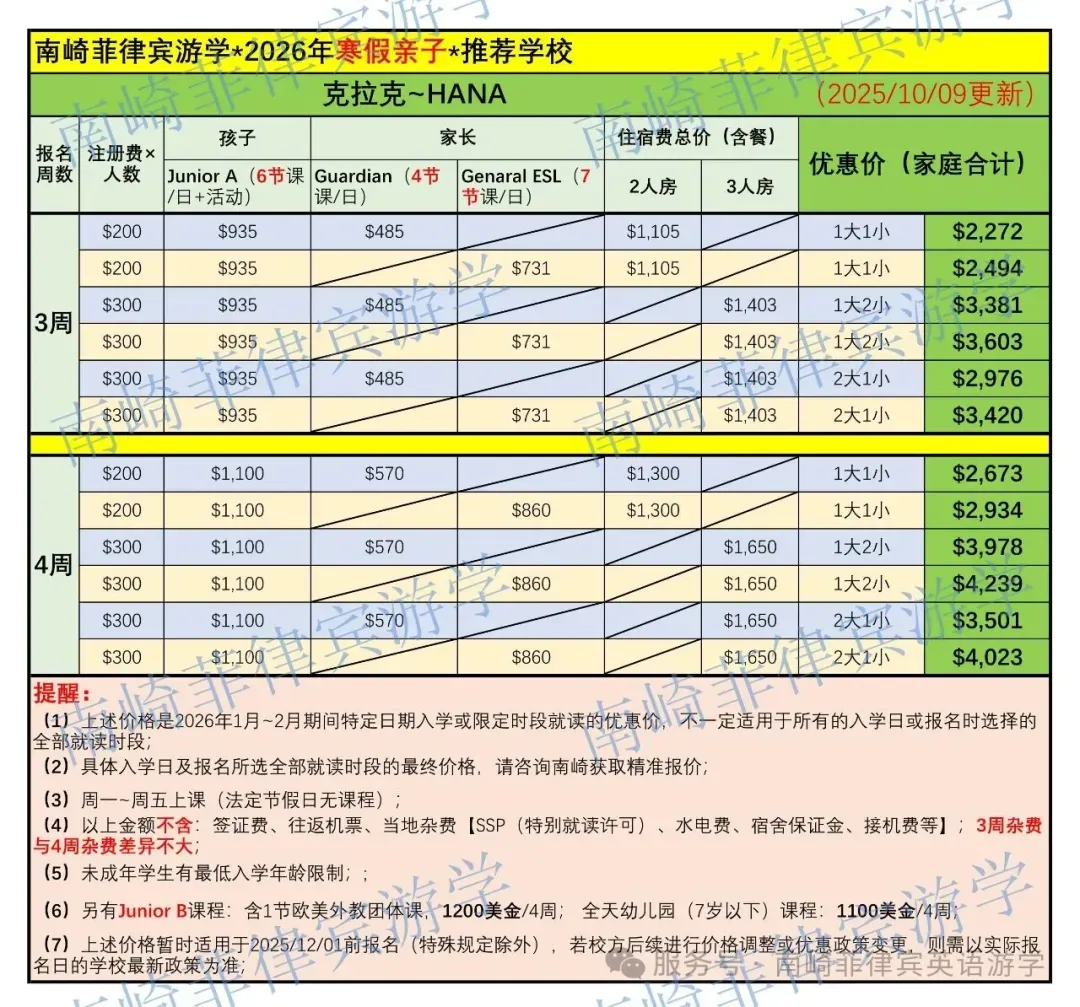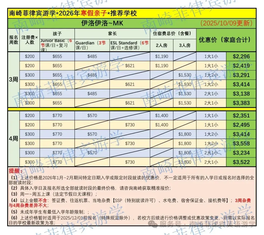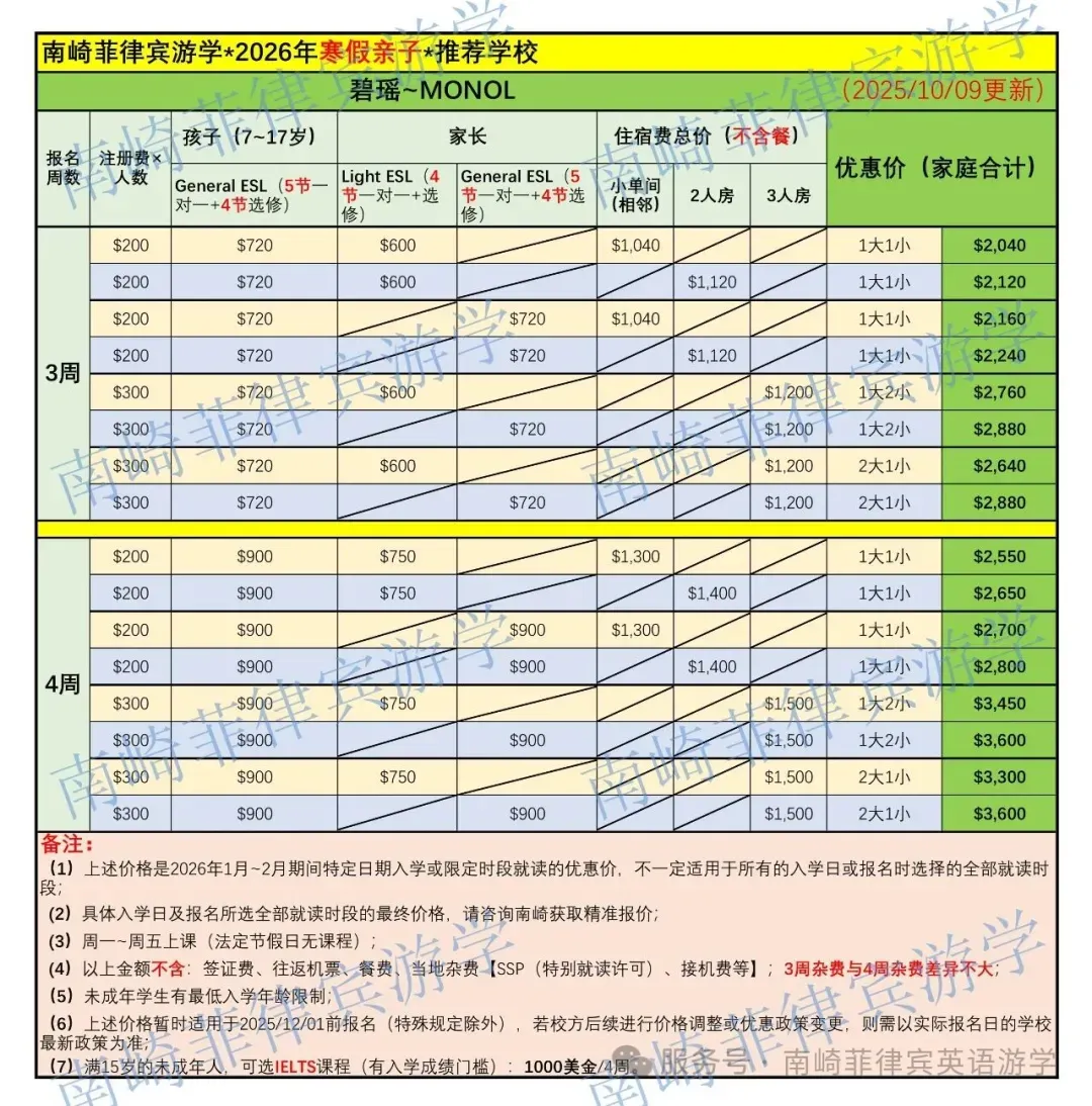 寒假出行计划安排好了吗?本文整理了菲律宾 碧瑶 克拉克 伊洛伊洛 地区(非宿雾) 的部门热门学校在 2026年1月和2月寒假期间 的亲子课程价格及开班情况。