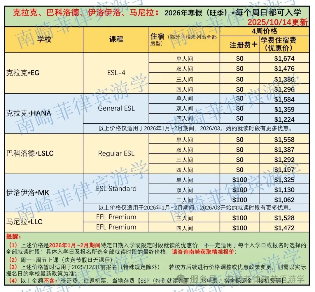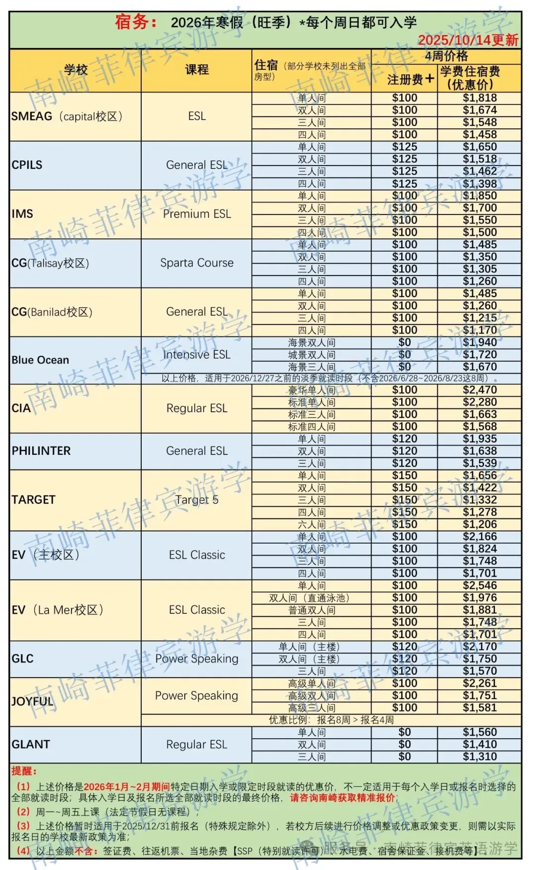 2026寒假菲律宾游学倒计时不到3个月! 计划寒假来菲律宾游学的成人同学,可参考南崎整理的各校信息: