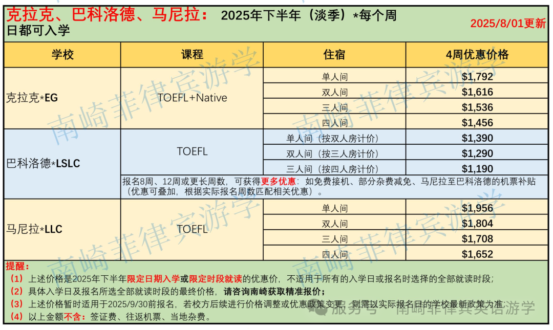 南崎汇总了菲律宾主流语言学校 托福 课程在2025年淡季的最新价格清单 ,相比旺季,学费更具性价比,学习环境也更加安静专注,老师选择范围更广,最关键是价格优惠更多。