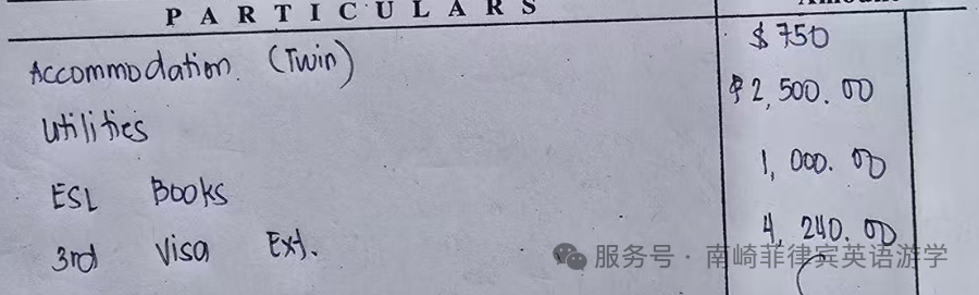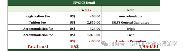 先安排ESL课程过度:这个部分学费是免费的!只要付住宿费即可!下图是南崎学员范例,该生入学考试不足4,安排ESL,只用付住宿费750美金+当地杂费即可,学费是免除的。