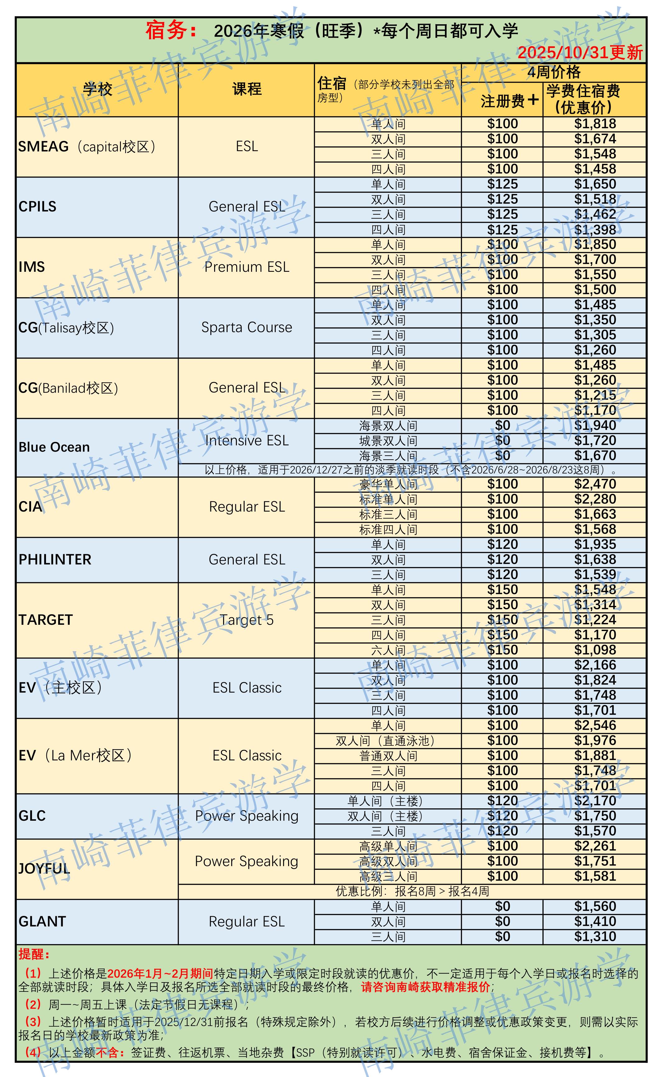 2026寒假菲律宾游学倒计时不到3个月! 计划寒假来菲律宾游学的成人同学,可参考南崎整理的各校信息: